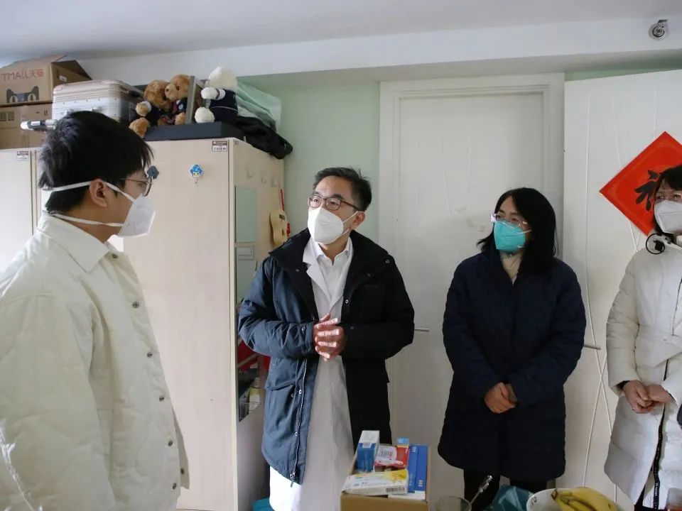 在学生宿舍,黄天荫与学生亲切交流,详细了解同学们的身体状况。他转达了清华大学副校长王宏伟教授对同学们的问候和鼓励,并表达了对医学生们在一线辛苦付出的感谢,同学们作为清华医疗体系的一分子,面对激增的医疗需求带来的压力,为民众的健康守护做出了积极的努力。他鼓励同学们要坚定信心,保护好自己,保持乐观的心态,积极参与临床工作,在实践锻炼中夯实本领,为国家、社会担起更大的责任。周月红代表医院党委向同学们表达了关心和慰问,仔细询问学生们的健康状况并关心药物储备是否到位,鼓励大家相互支持,共克时艰。