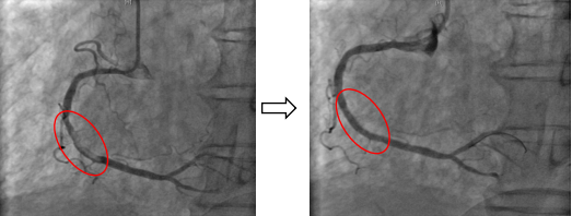 急诊冠状动脉介入术中,手术团队迅速锁定患者右冠脉内大量血栓,为患者进行了冠状动脉内血栓抽吸术、冠状动脉内球囊扩张术,并顺利植入1枚最新一代药物洗脱支架。术后患者的胸痛症状立即缓解,收入心脏内科重症监护室进行后续治疗。