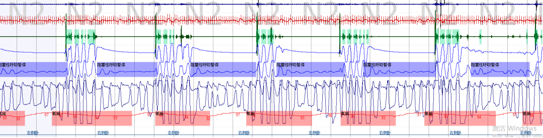 患者睡眠图上显示反复的呼吸暂停(蓝色部分)和反复的缺氧情况(红色部分)