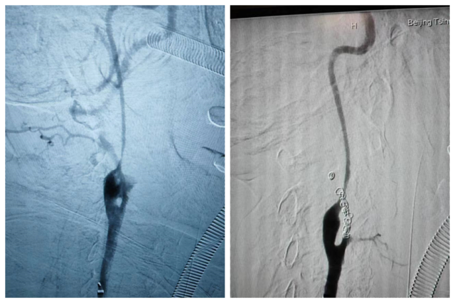 患者从急诊紧急接入手术室,就在此时,患者突发心脏骤停,血管外科、麻醉科、耳鼻咽喉头颈外科医师齐上阵,立即对患者实施抢救,三名医师轮流为患者进行心肺复苏数轮,患者逐渐恢复了自主心律。在麻醉科的保障下,血管外科曹战江医师、蒋超医师、李子澎医师联合手术,行股总动脉穿刺,造影可见颈外动脉被肿瘤侵犯破裂出血,行动脉栓塞后,出血最终止住了,患者的血压同步恢复稳定,转至重症监护病房。