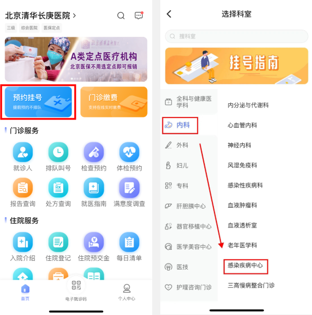 选择【预约挂号】-【内科】-【感染疾病中心】-【新冠康复联合门诊】