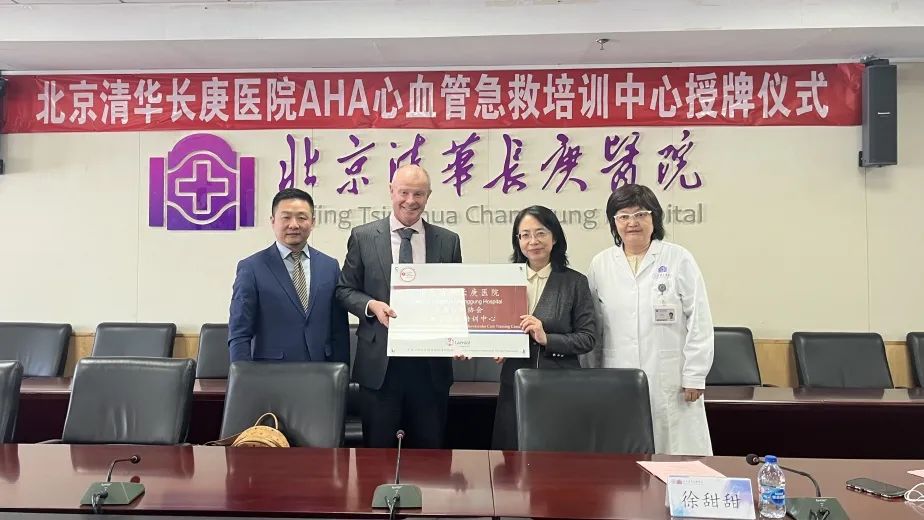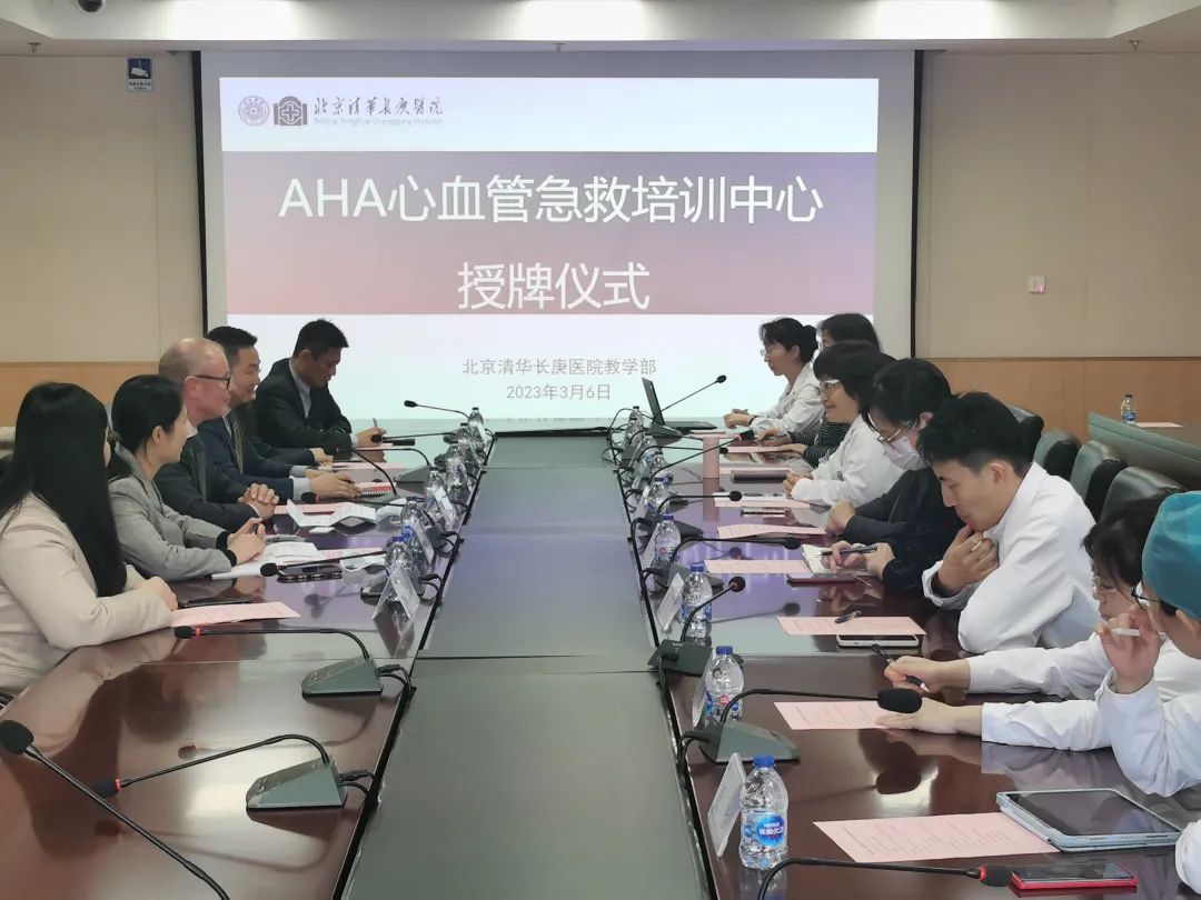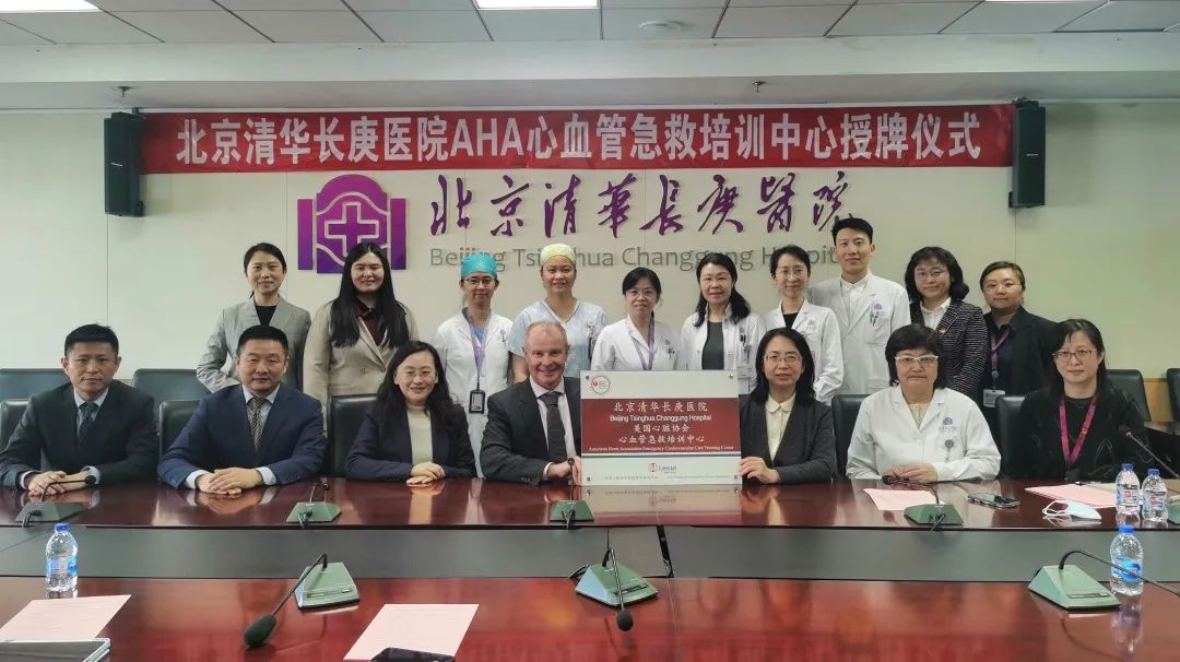 北京清华长庚医院3月7日电(通讯员 晁爽 李晓蕾)3月6日,清华大学附属北京清华长庚医院举办AHA(美国心脏协会,American Heart Association)心血管急救培训中心揭牌仪式。党委书记周月红、副院长陈旭岩等院领导及相关部门负责人、部分导师出席,美国心脏协会挪度国际培训中心亚太区总裁 Graeme Foulds、大中华区董事总经理薄会杰、中日友好医院教育处副处长丛鲁红等受邀参加活动。