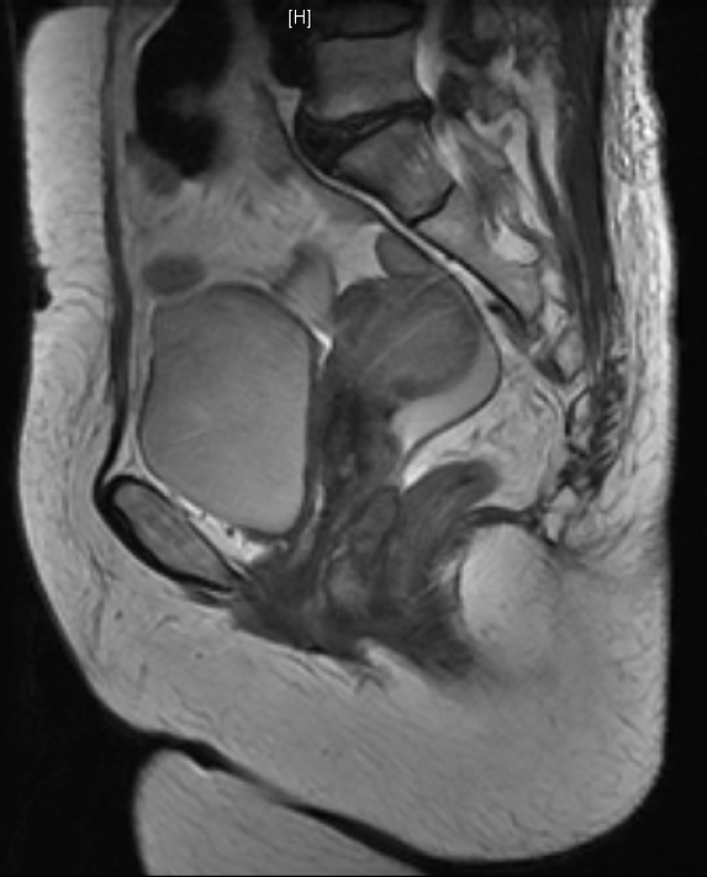 盆腔核磁可见直肠下段前壁增厚,可见不规则肿块形成,位于腹膜反折以下,肠壁较厚处约23mm,阴道后壁受压