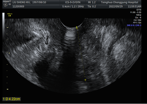 阴道后壁与直肠前壁间可见不均质实性肿物,范围约3.8cmx2.9cmx2.3cm,可见较丰富血流信号,近端距阴道口约0.54cm,远端距阴道口约4.22cm