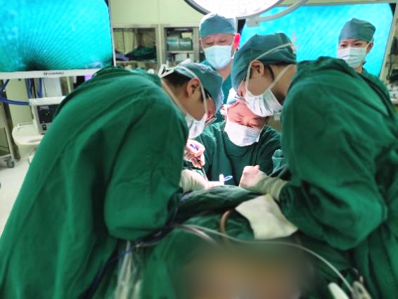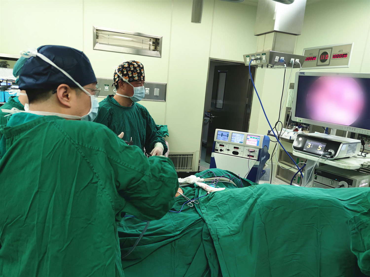 术中,在腹腔镜辅助下,李元新主刀,胃肠外科主治医师孙孝文辅助,小心游离直肠与肿瘤至直肠前壁与阴道后壁融合处。在肛缘上方8cm处,李元新离断直肠上动脉,保留肠壁血管上方血供,确保拖出肛门的结肠段边缘能扪及搏动,避免拖出肠段坏死。