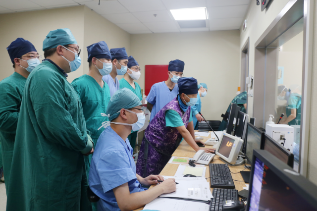 图为冯晓彬(右一)在院内指导开展钇[90Y]手术
