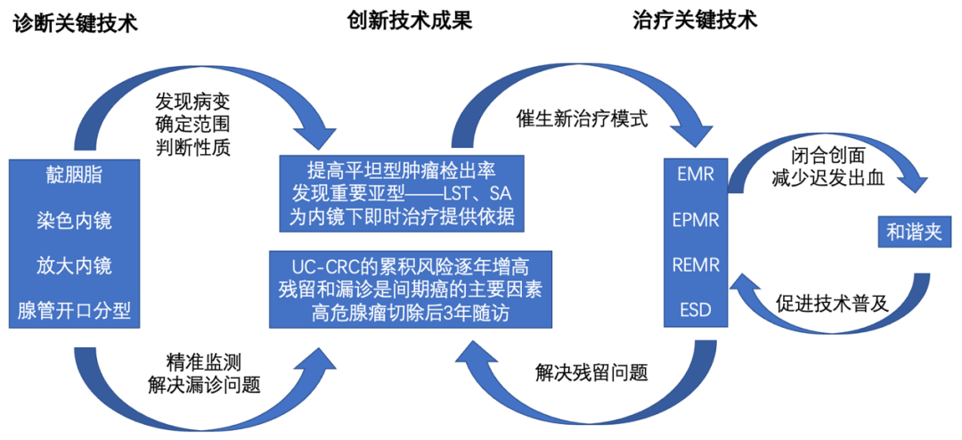 结直肠肿瘤分为隆起型和平坦型,20年前,由于对平坦型肿瘤认识不足,且在国内无商品化粘膜染色剂,染色内镜难以开展,因此,国内早期结直肠癌的内镜诊断率较低。为提高结直肠肿瘤内镜下诊治水平,项目组重点研发了粘膜染色剂靛胭脂并建立了以靛胭脂为关键试剂的染色内镜和放大内镜的方法,以及 EMR/ESD 等肿瘤治疗微创关键技术,构建并完善了结直肠肿瘤的精准诊治体系并应用于临床,为结直肠癌的早诊和白光内镜难以发现的平坦型病变的诊治提供了完整的内镜下诊治解决方案。