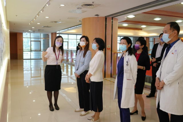 王瑞瑜一行首先实地走访医院医疗楼,瞻仰坐落于门诊大厅的王永庆创办人雕像,驻足承载着清华长庚筹建发展历程的文化墙前细细聆听,了解二期工程进展,并对医院员工致以亲切问候。