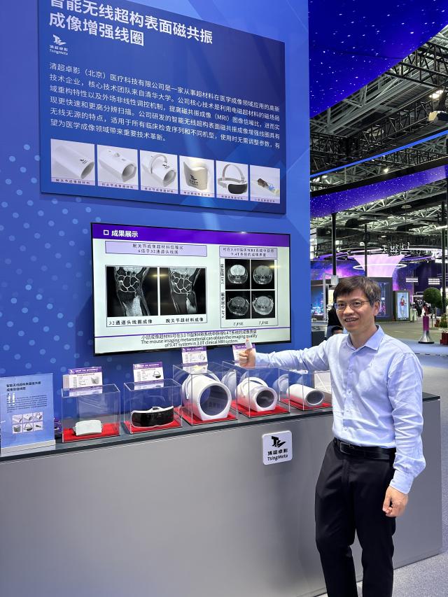 在本次高水平的展会中,团队首次展示了六款“智能无线超构表面磁共振成像增强线圈”,包括甲状腺、眼部、膝关节、腕关节、肘关节和小动脉成像线圈。这些线圈利用电磁超材料制成,可重构局域磁场特性,并可实现对外磁场的非线性调控,从而可对人体发出的磁共振信号进行直接放大,显著提升图像信噪比,实现更高分辨率、更快速、和更强大功能的磁共振扫描。