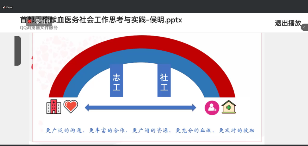 侯明以《首都无偿献血医务社会工作思考与实践》为主题,分享首都无偿献血志愿服务经验。血液无法生产,唯一来源就是依靠他人的捐献,如何科学、广泛的动员更多社会民众加入到无偿献血的队伍当中来,携手共筑血液生命防线,更加坚定了志愿者们为团体无偿献血宣传动员工作贡献专业知识和青春力量的决心和信心。