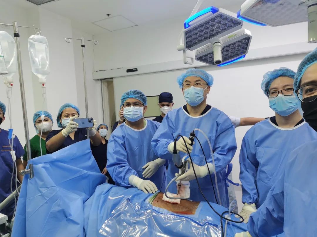 李建兴一行首先来到(Tagbilaran City) GCGMH医院,进行为期一天的手术演示。塔比拉兰市位于菲律宾南部偏远地区,结石病例复杂,医疗条件较差,当地仅有两名专业泌尿外科医生。经准备,李建兴与泌尿外科主治医师苏博兴,采用全超声引导下经皮肾镜技术,在克服手术器械不全、配合人员不熟悉等问题后,演示了一例8岁儿童肾结石、一例双侧鹿角形肾结石及一例肾积脓合并复杂肾结石手术,其精湛的手术技巧和先进的手术理念,得到了菲律宾医师的高度认可。此外,李建兴一行还手把手带教当地医生,并赠送了手术相关耗材,带动当地医疗水平的提高。
