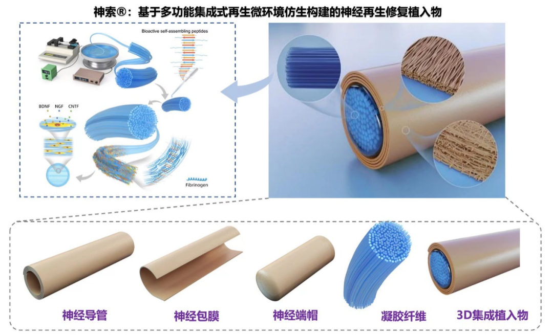 神索是基于国际原创的多级定向纳米纤维水凝胶液态电纺制备技术、仿生胶原纳米纤维气纺丝技术和分子自组装纳米技术,开发的多功能集成式的原创功能性神经再生修复材料。神索主要面向神经修复与功能重建材料及高端器械转化领域,在现有神经导管产品的基础上,通过仿生,基于自主开发的多模态生物功能材料,构建多功能集成式再生微环境,递送多模态神经再生调控信号,多维度协同促进血管新生和神经再生过程,实现损伤神经的快速生长和功能重建,在大鼠、比格犬、食蟹猴神经损伤中均展示了优异的快速诱导神经再生和运动功能恢复能力。
