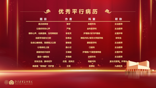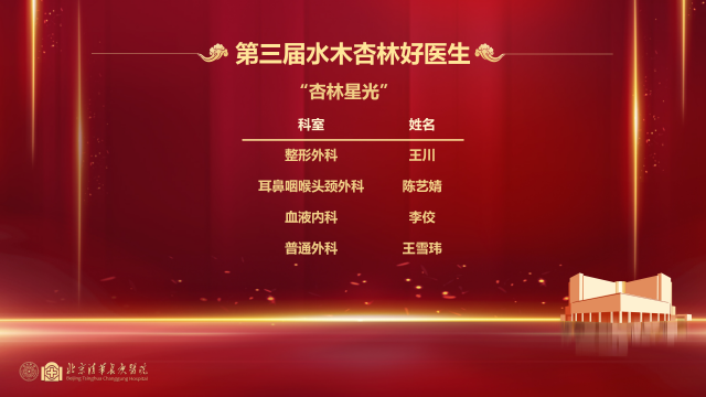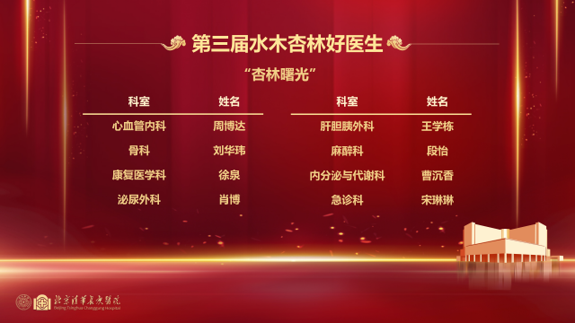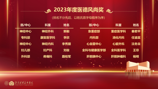 选树学习典范,医院从医疗、医德、科技创新、人文四个方面,组织了“第三届水木杏林好医生”、“2023年度医德风尚奖”、“优秀科技创新集体奖”、“创新领军人物奖”、“创新青年人才奖”、“优秀平行病历”评选与表彰。