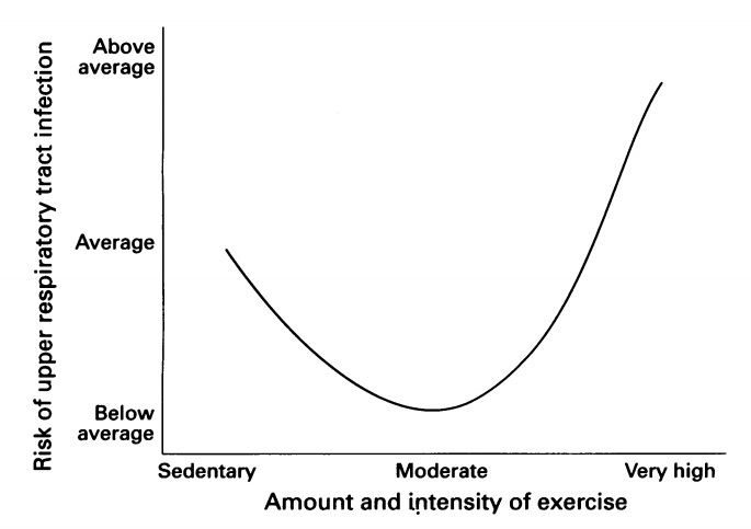 同时,免疫功能下降导致的上呼吸道疾病(URI),是运动医学中最常见的非损伤性相关伤害。《Upper respiratory tract infections and exercise》论文指出,随着运动强度提升,高强度运动有可能短暂地改变免疫系统,增加感染风险或诱发气道炎症。因此,在新冠等呼吸道疾病高发期间,运动训练更需注意强度与频率控制。