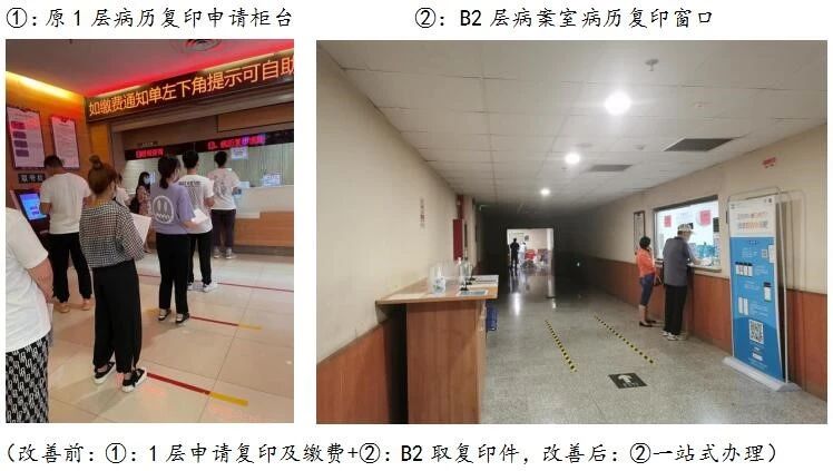 医事处于2021年8月整合现场1层病历申请缴费及B2复印取件窗口,实现现场复印一站式服务。结合微信复印申请分流,患者病历复印现场排队等候时间大幅缩短。