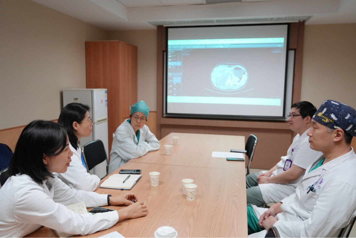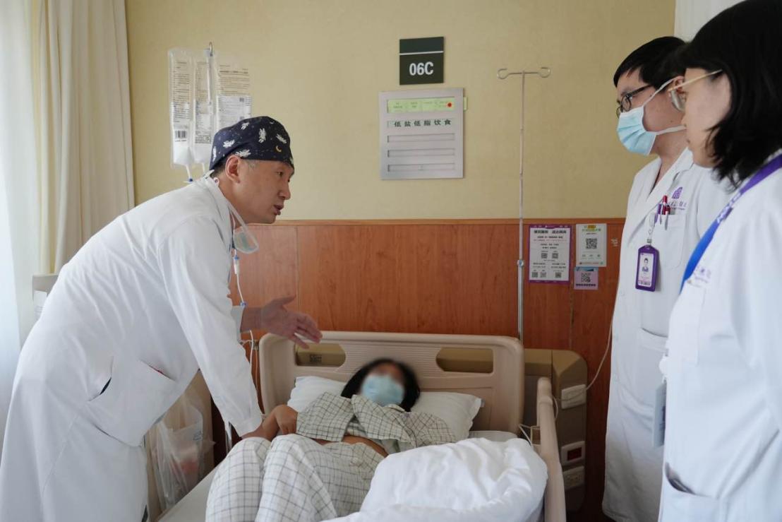 切除肿瘤,相当于把包绕的“面团”剥离出去,而不能伤及裹在面团里的血管,术中稍有不慎就会造成瞬时的大出血,患者生命岌岌可危,需要立即进行血管修补或吻合,而肠系膜上动脉、腹腔干动脉直径4-5毫米,加之患者肾动脉存在变异,右肾下极副肾动脉直径仅2毫米,这对血管缝合提出了精度要求。诸如此类的挑战,在肿瘤外科常规开展的腹膜癌手术中,已屡见不鲜,肿瘤外科与肝移植科副主任医师宋继勇已多次联合手术,攻克上述难关。此次,李雁主任和宋继勇主任再度联手,并特邀麻醉科、内分泌与代谢科、泌尿外科、肿瘤内科、放射科等相关科室进行术前MDT(多学科联合团队)讨论,最终明确了手术方案、风险及应急预案。