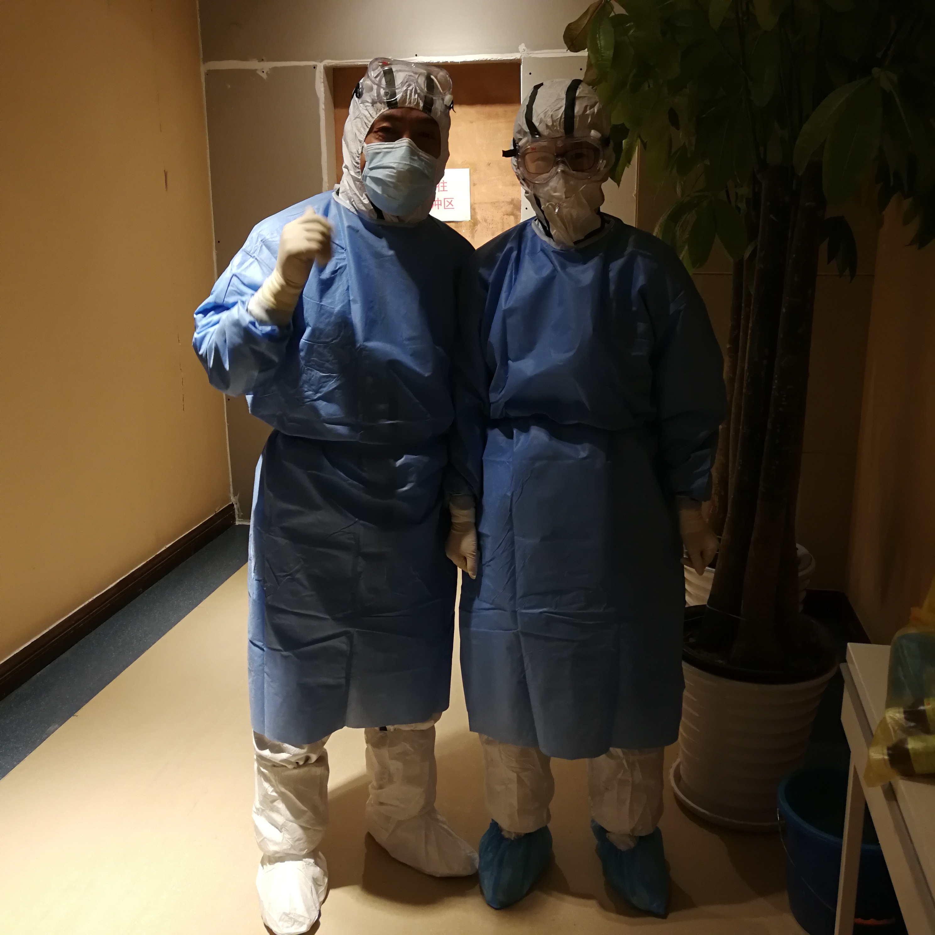 图为在隔离病房的眼科主任胡运韬(左)