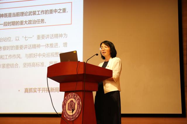 周月红指出,习近平总书记“七一”重要讲话立足中国共产党百年华诞的重大时刻和“两个一百年”历史交汇的关键节点,回望光辉历史、擘画光明未来,是新时代中国共产党人不忘初心、牢记使命的政治宣言,是我们党团结带领人民以史为鉴、开创未来的行动指南。周月红从深入领会全面建成小康社会的历史性成就、深入领会党团结带领人民不懈奋斗的光辉历程和伟大成就、深入领会伟大建党精神的深刻内涵和时代价值、深入领会以史为鉴开创未来的根本要求等几个方面,对讲话进行了详细解读。