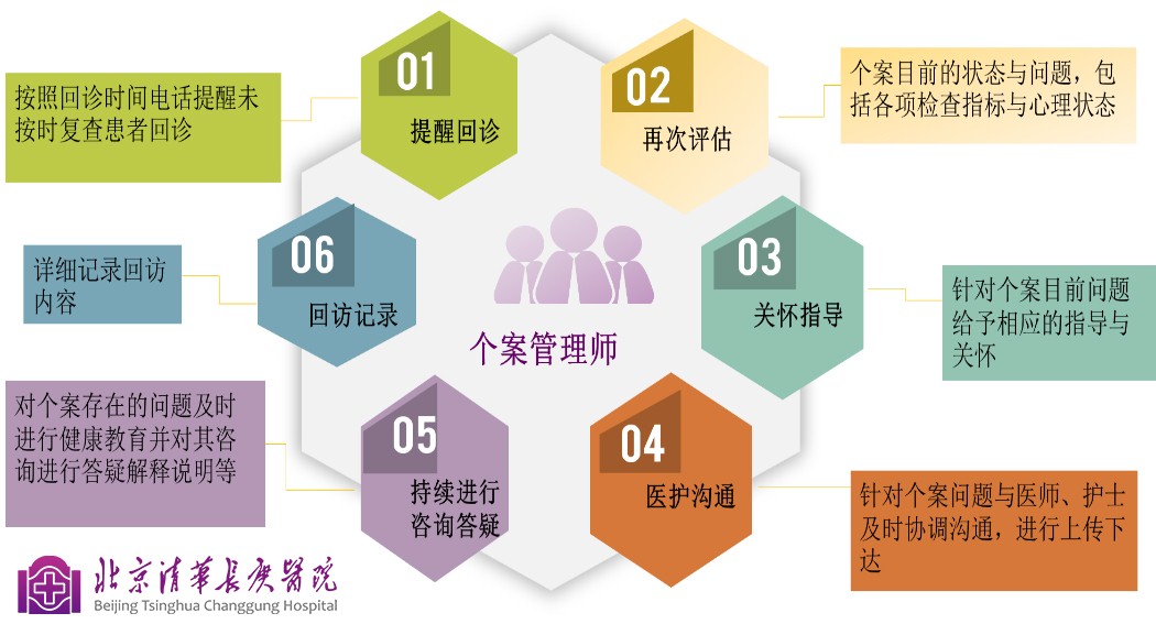 治病,很多时候不是一次性的,如肿瘤类的重大疾病,需要住院及定期复查;而糖尿病、高血压、哮喘等慢性病,则需要长期的自我管理与医院治疗相结合。在这个过程当中,除了医生给予的专业诊疗外,很多患者会遇到具体的问题需要咨询,或者离院后,往往疏于疾病后期管理,为此,北京清华长庚医院设立“个案管理师”,加强对专病患者的系统管理。