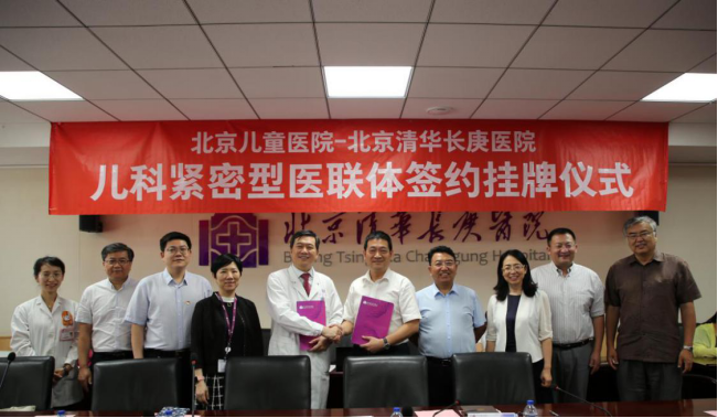 北京清华长庚医院6月14日电 6月14日,北京儿童医院院长倪鑫,北京清华长庚医院执行院长董家鸿,分别代表双方医院,签署市属医院紧密型儿科医联体建设协议,“北京儿童医院清华长庚诊疗中心”正式揭牌成立。仪式由北京清华长庚医院党委书记周月红主持,北京市医管中心医疗护理处刘立飞副处长出席。