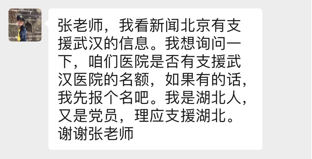 会议刚刚结束,李京京和顼晋昆两位医生就积极进行了报名。来自湖北的护士郝珊珊,在得知武汉的疫情后第一时间给支部书记发来信息,要求上一线,希望能为家乡贡献自己的绵薄之力。