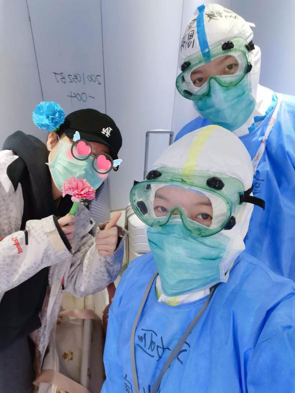 出院的帆帆,是我尤其想献花的一位留学生。隔离观察区里,常有来自各个国家的人员,英语则成为了通用的语言,当我遇到交流障碍或者心里没底的英语写法时,总会向这位在英国留学的小姑娘请教。我是她的贴心护士姐姐,她成为了我的金牌翻译。还记得我把康乃馨拿给她时,她开心地和我们比起yeah的手势,还惊讶于我们手工的逼真程度。