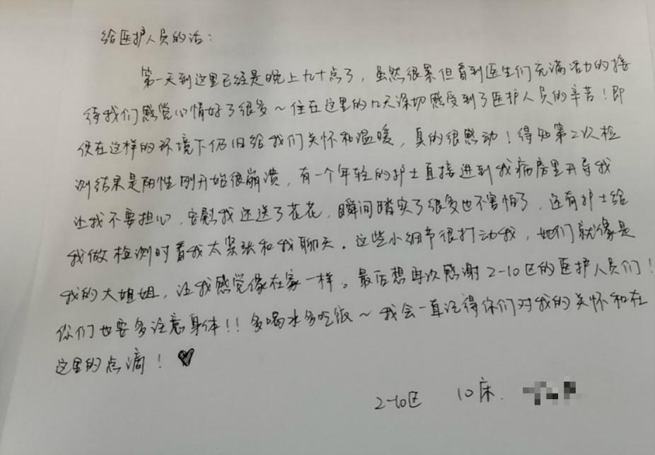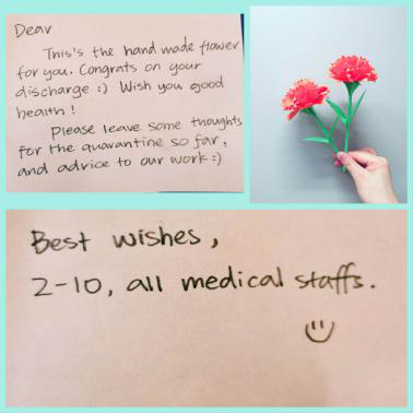 图为一位需筛查人员回家前手书的感谢信里特别提到了折纸花
