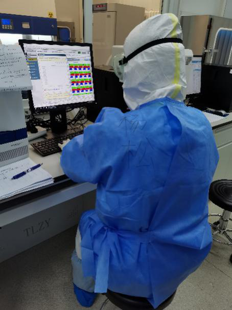 核酸检测包括样本接收、灭活、核收登记、试剂配制、核酸提取、上机扩增、结果分析等多个环节,不仅复杂繁琐,还充满危险,一轮下来至少用七八个小时。我们24个人分成6组,24小时不间断地进行检测,每次实验完成,脱下防护服的时候,内穿衣已经全部湿透,头发也湿成一绺一绺的,嗓子眼冒烟,脸颊被勒出深深的印痕,但大家无怨无悔,眼神坚定,拧成一股绳,保卫首都人们的健康生活。