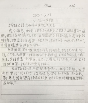 孩子想妈妈了,他没说出口,但是他渴望的眼神告诉了我。他让我不由得想到了暂送到父母家我自己的女儿。这次疫情,是我与女儿分开最长的一次,身为妈妈的我,又何尝不日思夜想着她!下班回酒店的路上,收到姥姥发来孩子写的周记: