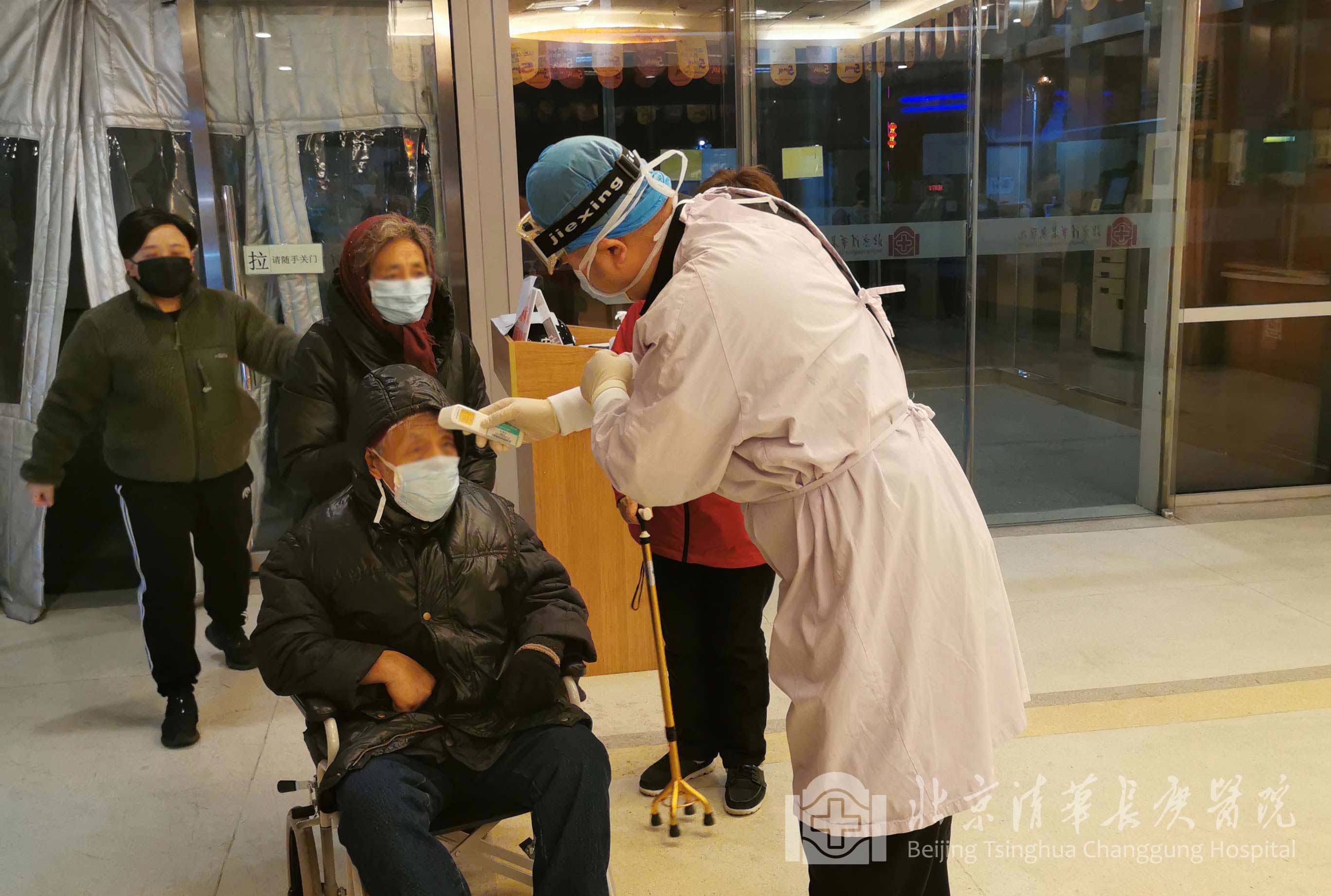 北京清华长庚医院在医疗楼各入口设置预检分诊台,为来院人员测量体温,做流行病学排查,并为未佩戴口罩的人员免费发放口罩。