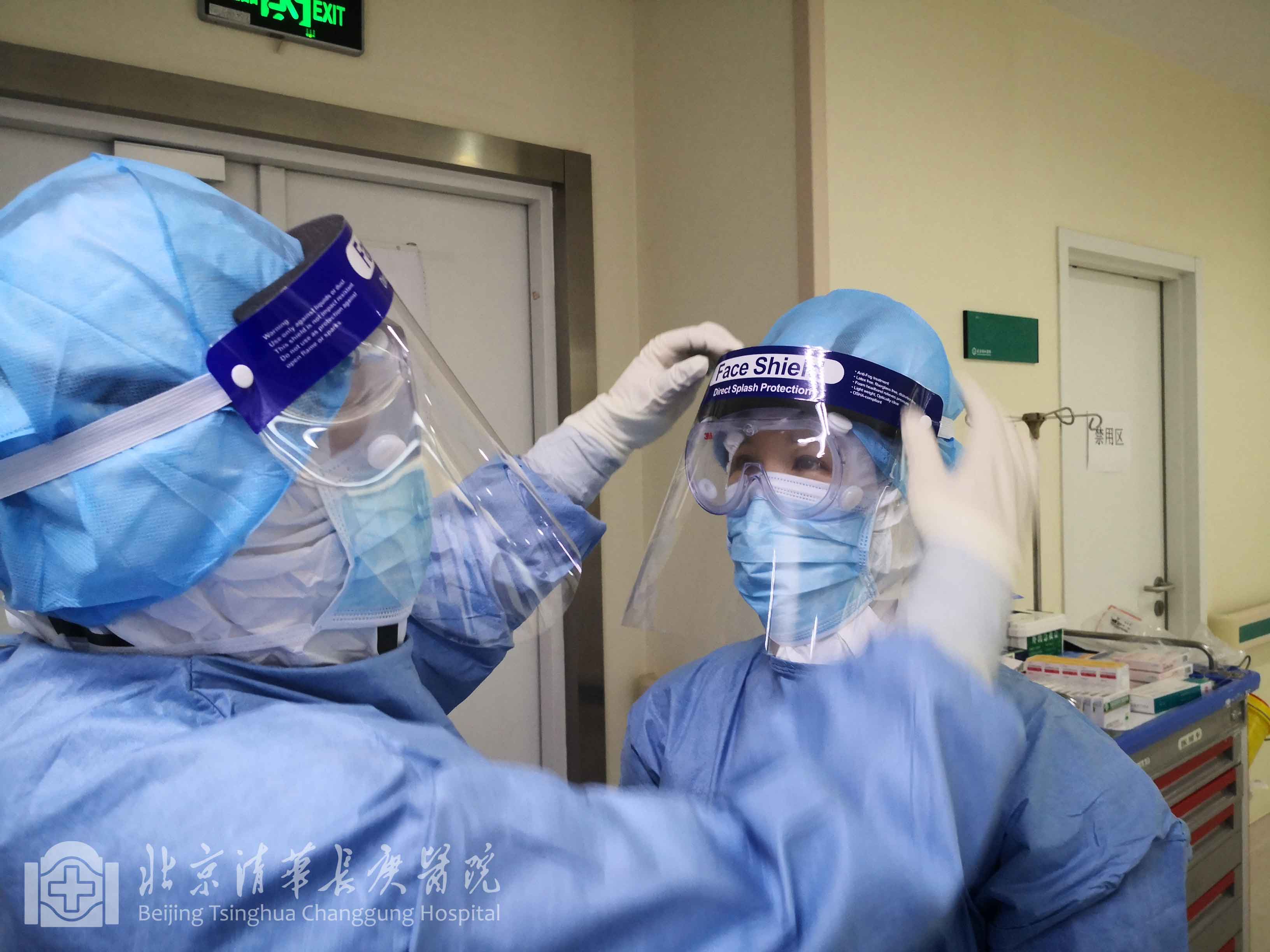北京清华长庚医院支援武汉医疗队正式进入病区前互相检查防护服