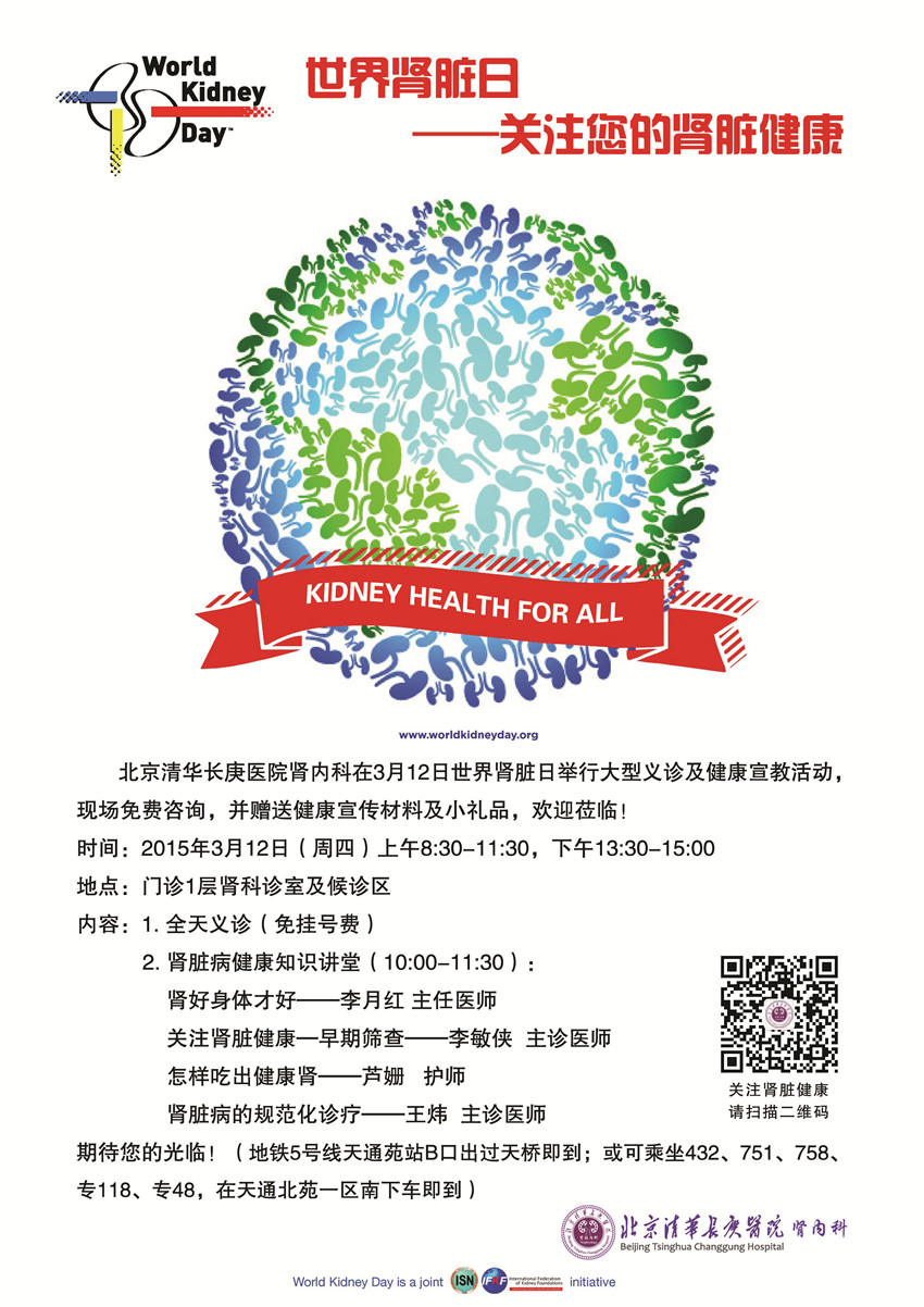 3月12日是世界肾脏日,北京清华长庚医院肾脏内科在李月红主任的带领下,将在院内门诊开展专家义诊与讲座活动,关注您的肾脏健康。
