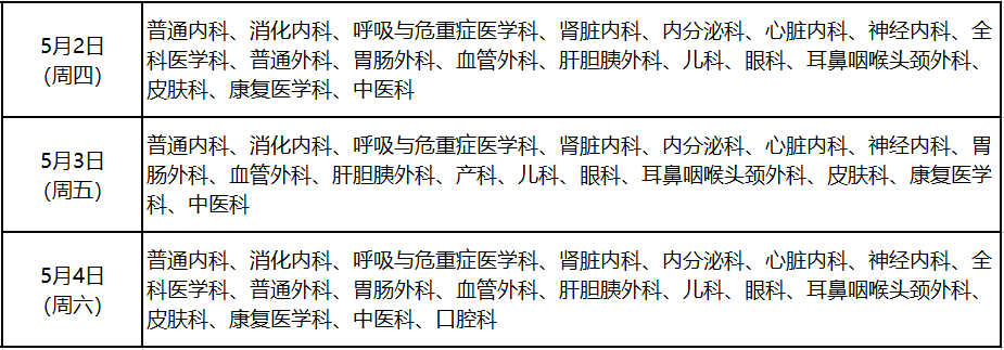 ☆本院劳动节假期门诊出诊科室一览: