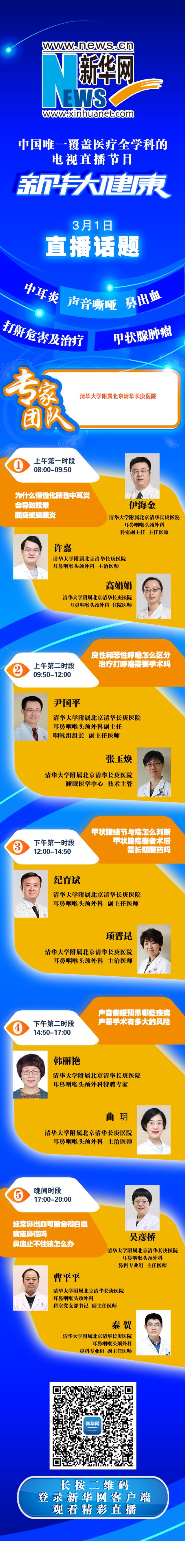 【直播预告】3月1日全天,清华长庚耳鼻咽喉头颈外科专家团队做客新华网大健康科普
