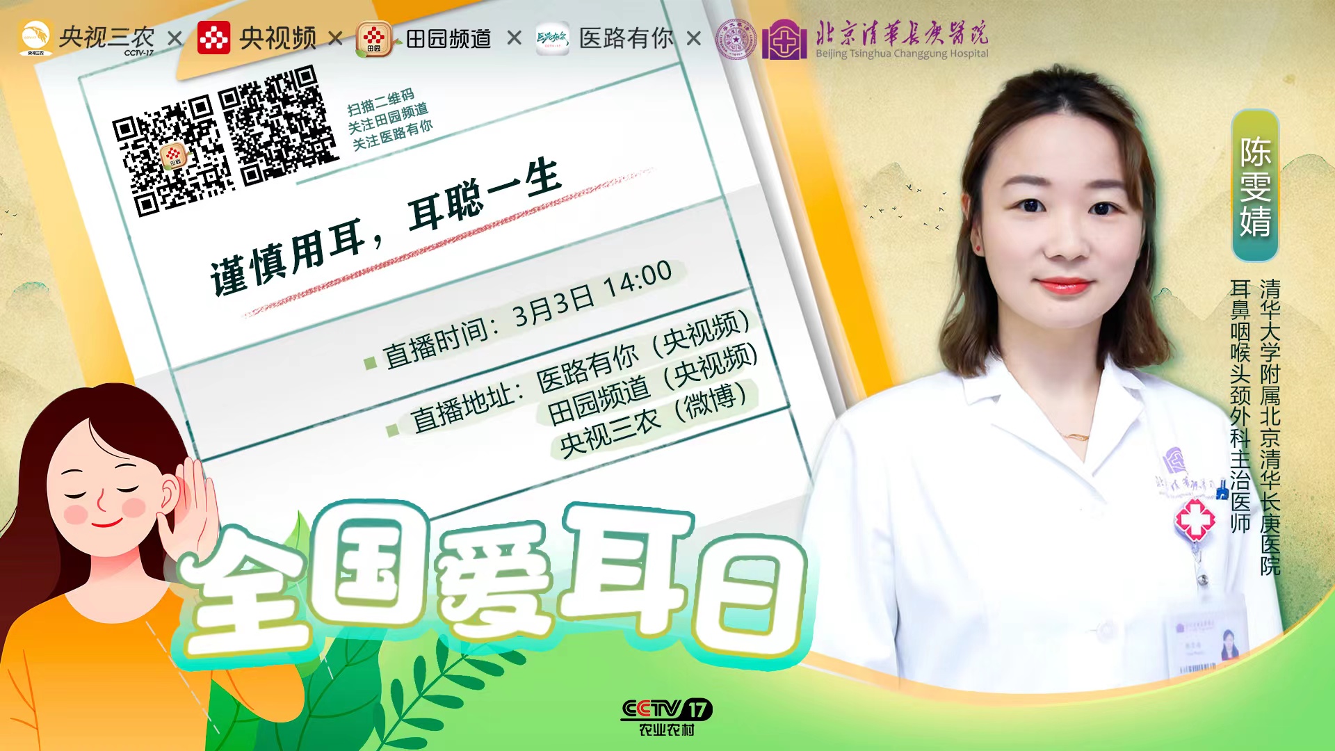 【全国爱耳日|小耳朵有大学问,谨防中耳炎,一起“听”未来】吸烟、感冒、游泳导致耳朵进水、长时间使用耳机等情况都有可能诱发中耳炎。那么,中耳炎有哪些症状?该如何治疗?3月3日14:00,清华大学附属北京清华长庚医院耳鼻咽喉头颈外科主治医师陈雯婧做客央视频[医路有你]的直播间,和大家聊聊中耳炎的防与治。
