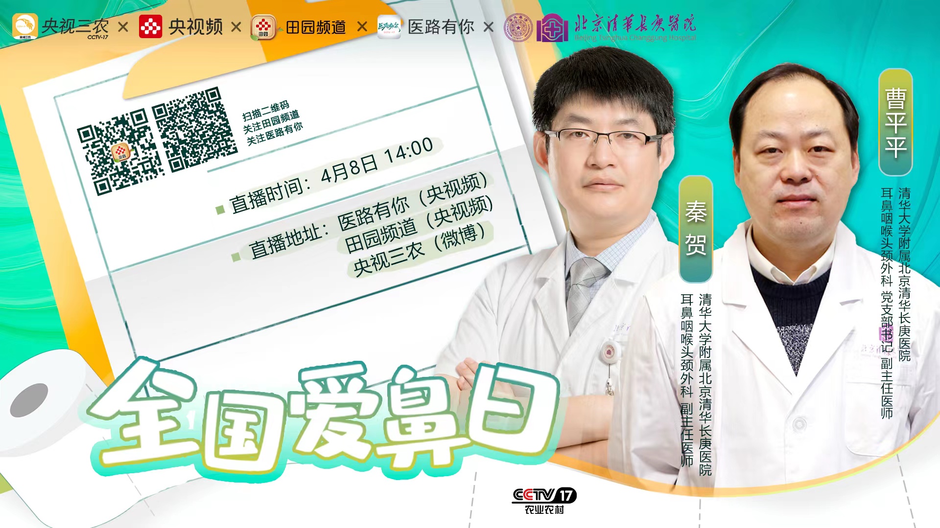 【全国爱鼻日|鼻塞、头疼,你以为的“感冒”可能另有隐情】鼻塞、头痛,以为自己感冒了?其实未必,下载央视频,关注@医路有你,4月8日14:00,清华大学附属北京清华长庚医院耳鼻咽喉头颈外科党支部书记副主任医师曹平平、副主任医师秦贺做客直播间,在全国爱鼻日即将到来之际,和大家聊聊隐藏在症状之下的疾病。
