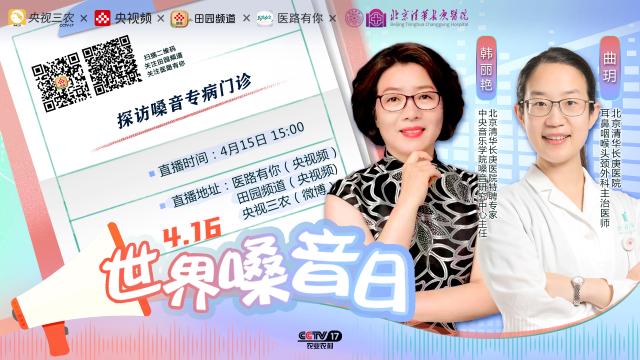 【世界嗓音日|如何才能拥有优质的嗓音?】您知道如何才能发出悦耳动听的声音吗?您知道常见的嗓音疾病有哪些吗?在世界嗓音日即将到来之际,清华大学附属北京清华长庚医院耳鼻咽喉头颈外科主治医师曲玥将带您一起探访嗓音门诊,更有医院特聘专家、中央音乐学院嗓音研究中心主任韩丽艳现场教您科学发声,分享锻炼嗓音的方法,欢迎扫描下方海报二维码,4月15日15:00,不见不散!