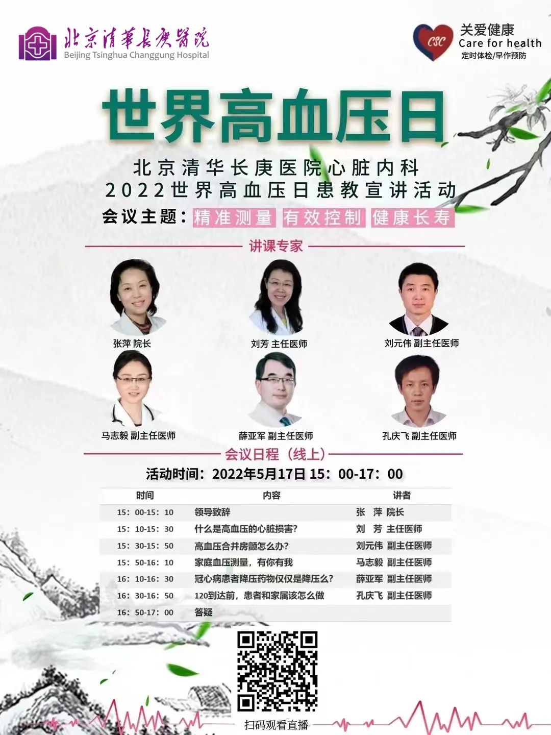5月17日15:00,清华大学附属北京清华长庚医院心脏内科团队将举办线上健康宣教活动,和大家聊聊最关心的高血压问题。扫码观看!
