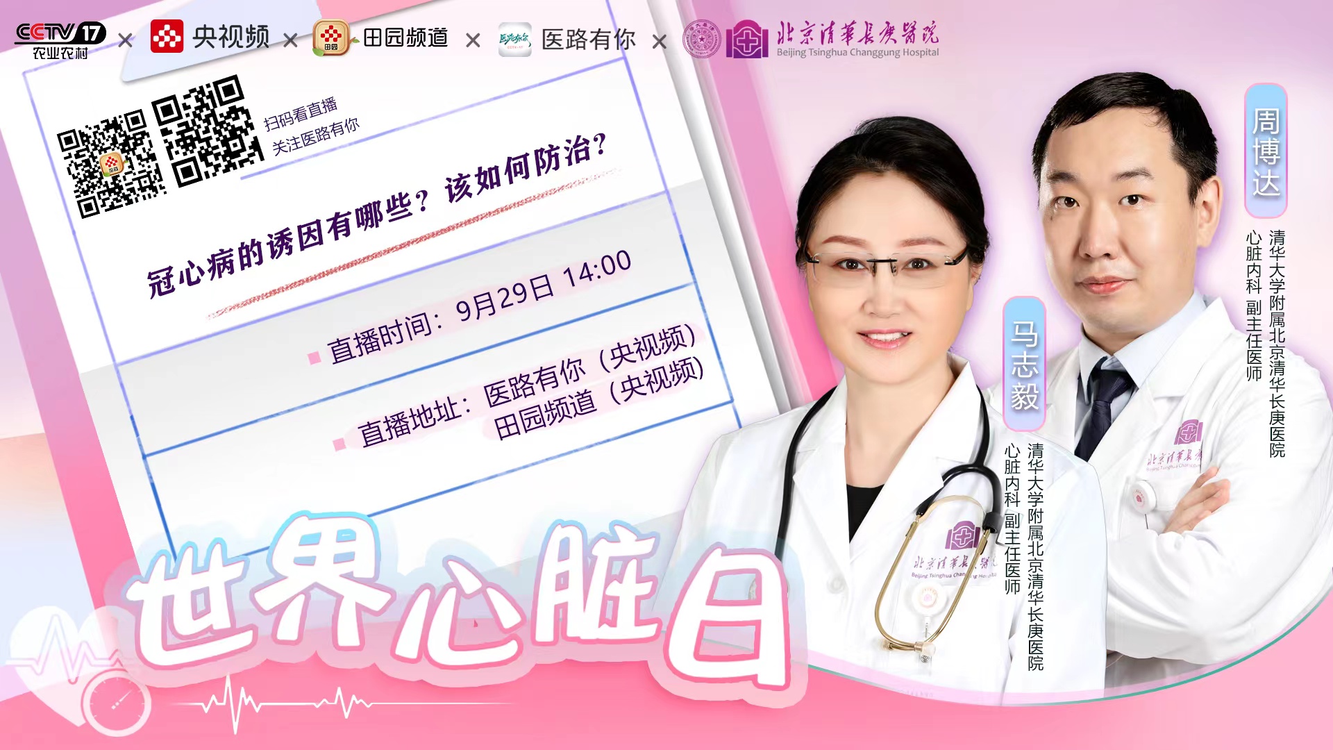 【世界心脏日|冠心病高发季,请收下这份护“心”攻略】近年来,越来越多人的健康受到冠心病的威胁,尤其是在秋冬季。那么,冠心病的诱发因素有哪些?目前有哪些治疗方法?我们该如何有效地预防?2022年9月29日是世界心脏日,下午14:00,清华大学附属北京清华长庚医院心脏内科副主任医师周博达、马志毅将做客央视频直播间,和大家一起爱“心”护“心”,健康同行。