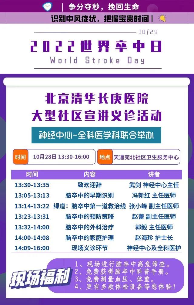 10月29日是第17个世界卒中日,今年的主题是“识别中风症状,把握宝贵时间”,宣传口号是“争分夺秒,挽回生命”。如何早期识别脑卒中?如何进行早期预防?10月28日(本周五)13:30-16:00,清华大学附属北京清华长庚医院神经中心将联合全科医学科在天北社区卫生服务中心举办线下疾病日宣讲及健康咨询活动,欢迎广大居民到场咨询~