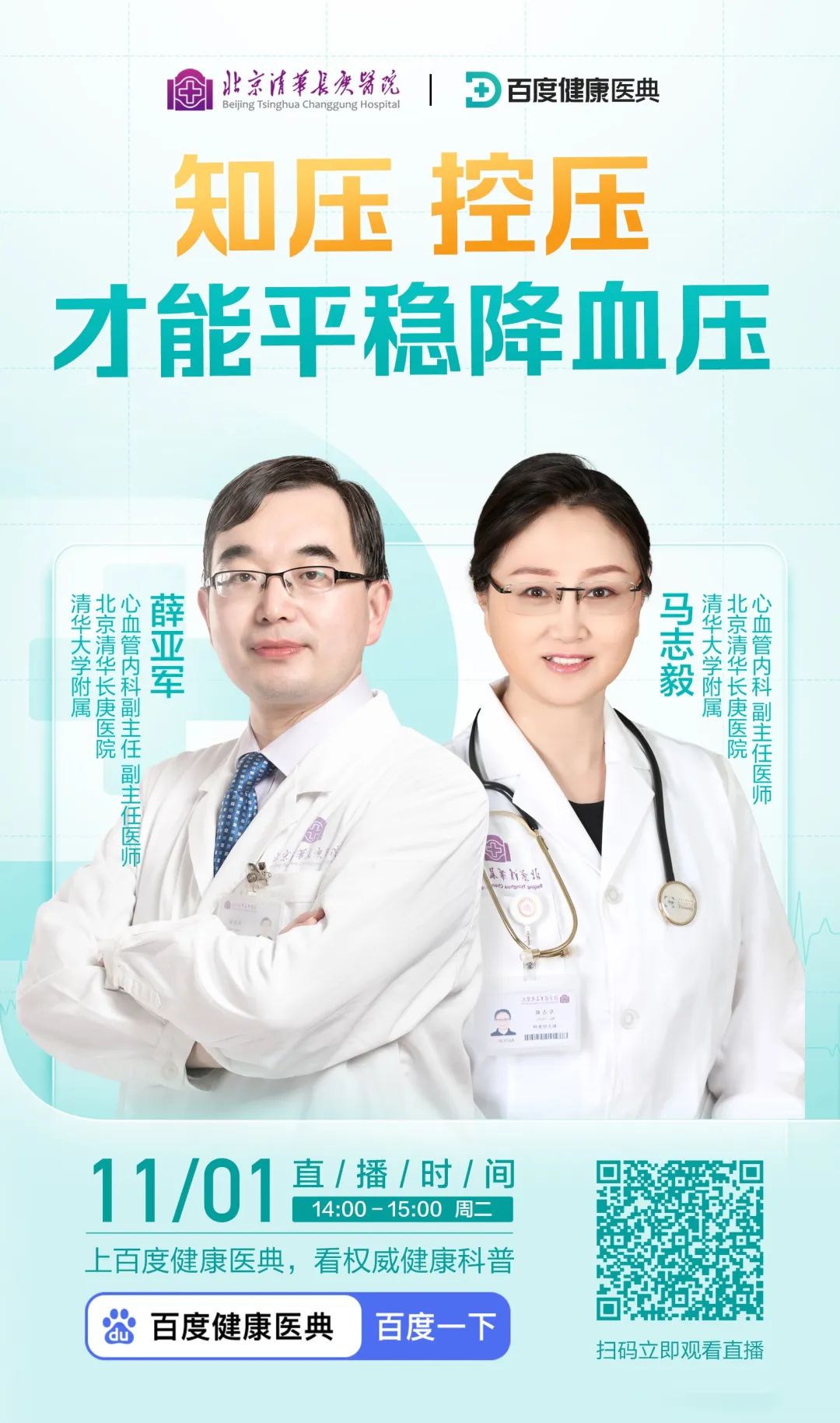 如何知压、控压,平稳降血压?11月1日14:00-15:00,清华大学附属北京清华长庚医院心脏内科副主任薛亚军,副主任医师马志毅将做客百度健康,和大家一起聊聊高血压的健康知识。