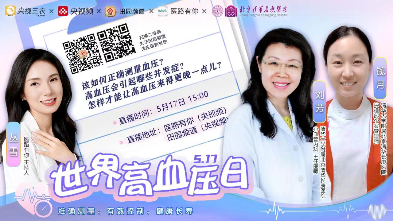 5月17日是世界高血压日,血压多高算高血压?高血压会引起哪些并发症?我们怎样才能让高血压来得更晚一点儿?5月17日15:00,清华大学附属北京清华长庚医院心血管内科主任医师刘芳、护理部个案管理师钱月将做客央视频·医路有你的直播间,和大家一起聊聊如何做到早发现,早诊断,早治疗,希望大家都能控制好自己的血压。