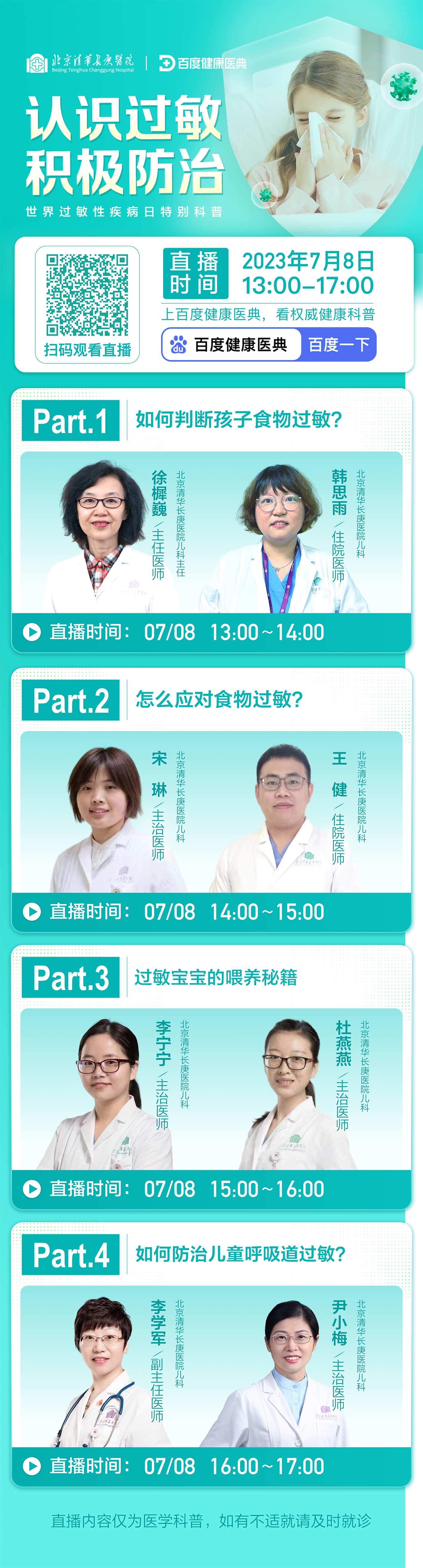 7月8日世界过敏性疾病日,我院儿科徐樨巍主任带领团队做客百度健康医典直播间,为大家带来儿童过敏性疾病相关科普知识,欢迎扫码观看!