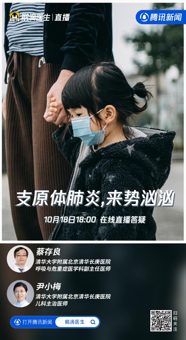 10月18日晚18:00,清华大学附属北京清华长庚医院呼吸与危重症医学科蔡存良医师、儿科尹小梅医师来跟大家聊聊,支原体肺炎爆发期,该如何预防治疗。欢迎扫码观看!