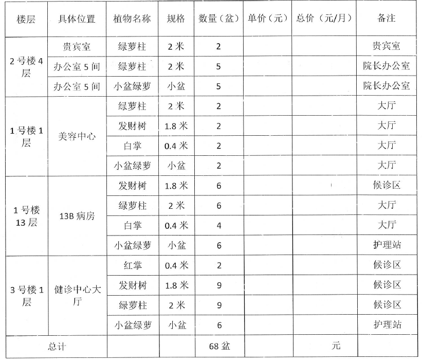 一、我院绿植租赁摆放合作即将到期,我院绿植需求及摆放点位如附件1所示,现拟请符合资质的经销商于2022年3月8日下午5点前至我院二号楼采购处进行资格报到。