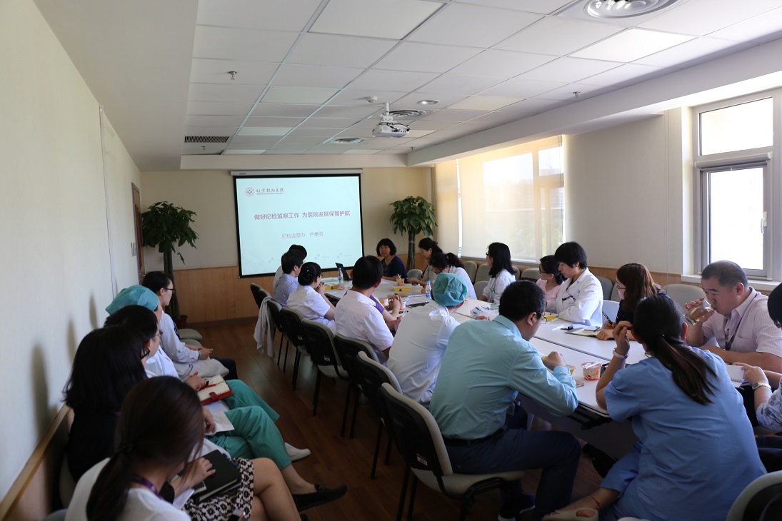 会上首先邀请朝阳医院纪委副书记兼纪检监察办主任严惠芬就基层纪检工作进行授课培训。严惠芬书记分享了自己从事纪检监察工作以来的经验和总结,她从当前反腐败的形势和任务开始,谈到纪检监察干部的工作要求归纳为六个字“忠诚、干净、担当”,她指出纪委应强化监督责任,要协助党委抓好廉政建设和反腐败工作,并详细介绍了朝阳医院在落实中央八项规定、反对“四风”、专项监督检查、信访举报工作等方面的工作经验。随后,纪委办再次通报了市卫生计生委关于切实加强北京市实施医改期间纪律工作的通知,要求严格落实“六个不准”,以严明的纪律保障医改政策措施不折不扣落实到位,并通报近期的纪委工作进展。