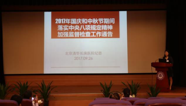 2017年国庆节、中秋节即将来临,为深入贯彻执行清华大学、北京市医院管理局关于落实中央八项规定精神的有关要求,防止“四风”问题反弹,进一步弘扬风清气正的节日氛围,9月26日,纪检监察办公室于全院干部会上开展“落实中央八项规定精神,加强监督检查工作通告”教育训练,纪委委员、纪检监察办公室负责人林琼菁主讲,党委书记周月红、纪委书记陈旭岩、总执行长郭明和等院级主管出席会议,各科室、行政部门负责人、护理长以上级主管、各党支部书记,团委书记参会。