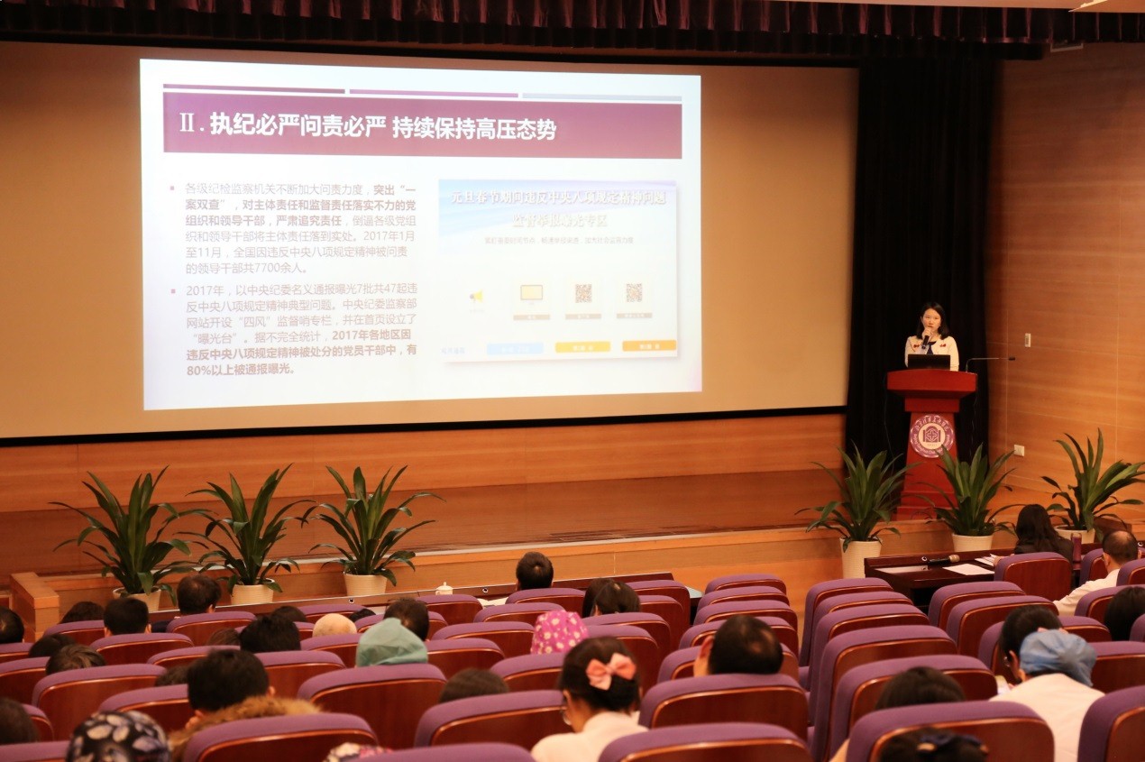 讲座首先回顾了2017年全国纪检监察系统监督落实中央八项规定精神、纠正“四风”所做的重要工作,包括十八届中央纪委七次全会召开,印发《中共中央政治局贯彻落实中央八项规定实施细则》,以违规公款购买消费高档白酒问题线索为切入点开展集中排查。2017年我院纪委结合纪检监察系统整体工作要求,认真落实日常检查与节点检查相结合、全面排查与重点检查相结合的要求,通过宣传教育和专项检查等工作,保持正风肃纪力度不减、节奏不变、尺度不松、氛围不淡,不断巩固拓展落实中央八项规定精神成果。
