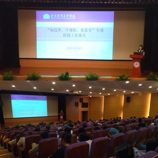 北京清华长庚医院8月31日电(通讯员 刘妍君)2018年8月30日,我院召开“知边界、守规矩、抓落实”专项工作阶段总结报告会,会议由纪委书记陈旭岩主持,院领导,院党委委员、纪委委员、各临床医技科室主任、部门长、护理部主管、工会及团委负责人参加会议。会上总结了我院开展专项工作的阶段成果,肯定了各党支部、部门、科室具体工作效果和好的经验方法,并明确了下一步的重点工作和具体要求。