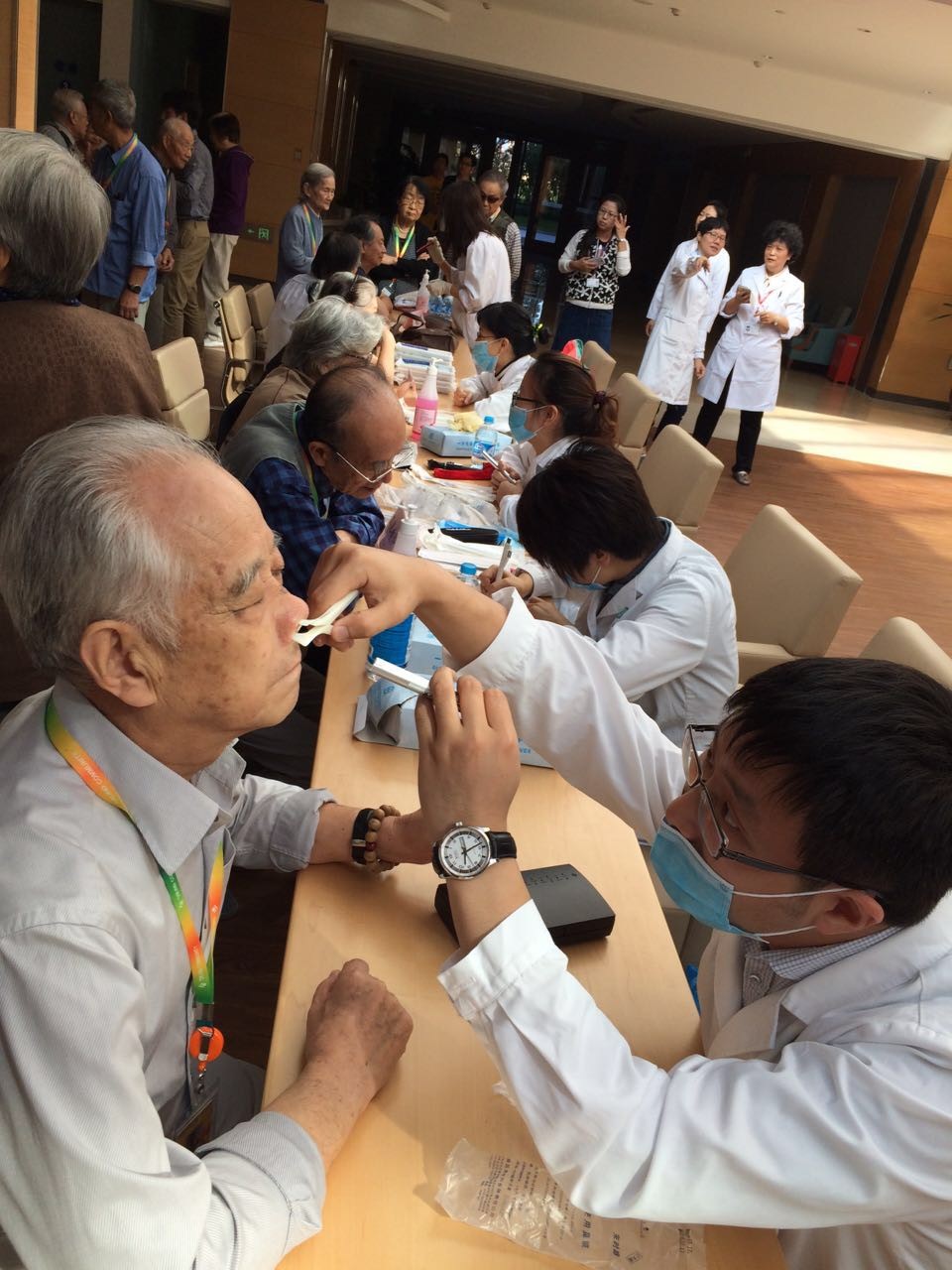 此次活动受到社区老人的热烈欢迎,清晨,当我院支部成员抵达位于昌平区南邵的燕园养老社区时,已有近50位老人坐在宽敞明亮的大厅等待我们的到来。医务人员迅速穿戴白衣、口罩、手套,准备好自带的检查设备和医疗用品,立刻投入健康咨询活动中。参与此次活动的专科和部门包括耳鼻喉头颈外科、眼科、口腔科以及医政组、经管组、医事处。活动现场我院医务人员免费为老人进行健康知识咨询及常规检查,免费派发健康宣教资料。更为有需要的老人留下联系方式,方便老人与医生沟通,以及至医院进一步的治疗。很多老人表示,清华长庚作为一家大型公立的综合性医院,能深入社区举办义诊和咨询,对于很多行动不便的老人来说,真正解决了他们的实际困难。这样的义诊活动办得好、办得实在,希望以后能常来!